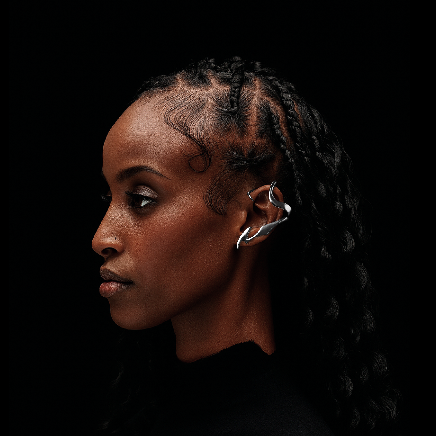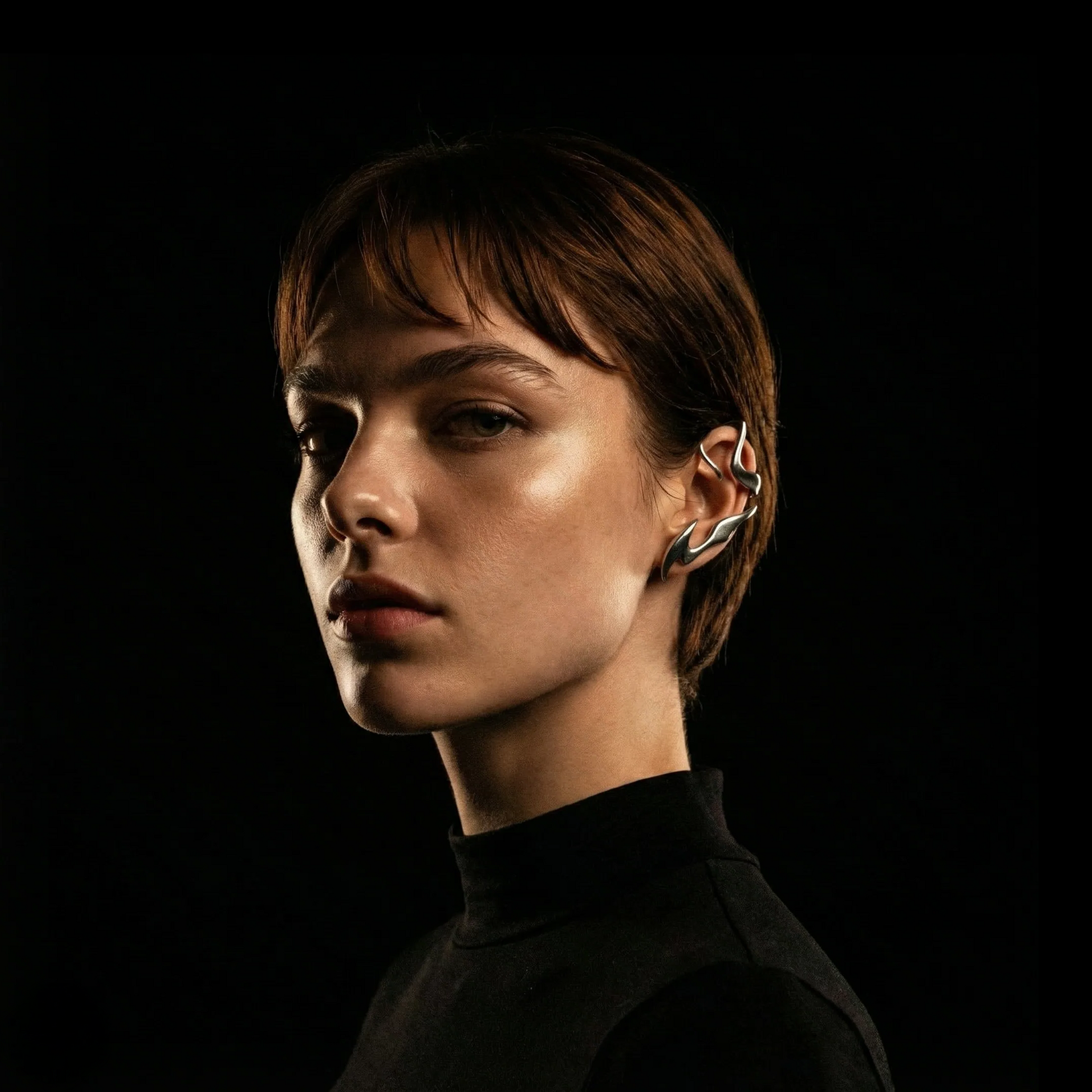 FLUID METAL, HIGH-STAKES STYLE. THE WAVE EAR CUFF MOLDS SEAMLESSLY TO YOUR EAR. INDUSTRIAL PRECISION, CYBERPUNK ATTITUDE.